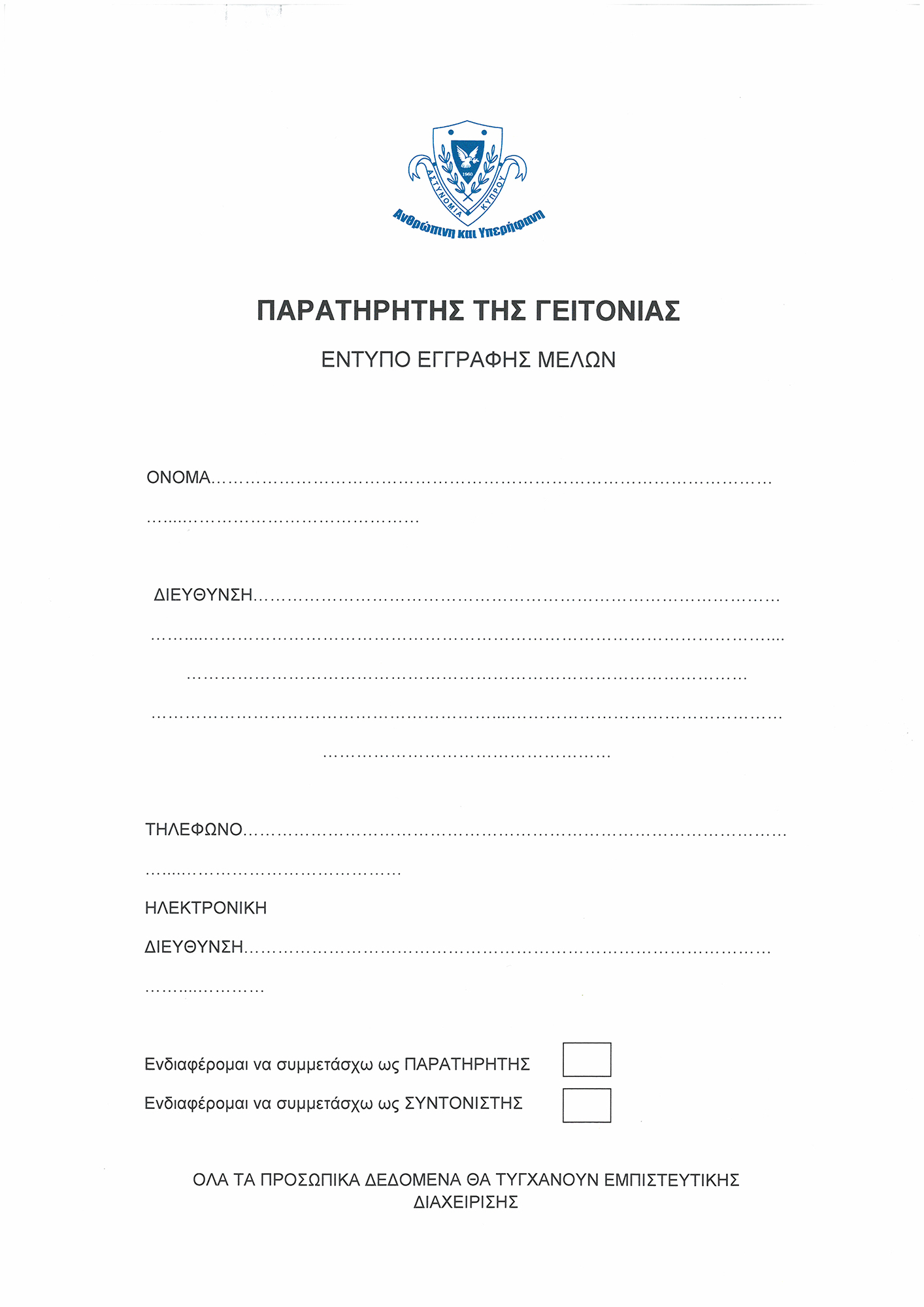 Δεν πρέπει να υπάρχει γειτονιά που το μάτι του παρατηρητή να μην επαγρυπνά στον οποιονδήποτε πιθανό παραβάτη ή εγκληματία που θα ήθελε να κάνει κακό στην οικογένειά μας, στο γείτονά μας, στην περιουσία μας ή ακόμα και στους Δημόσιους χώρους των Κοινοτήτων μας.