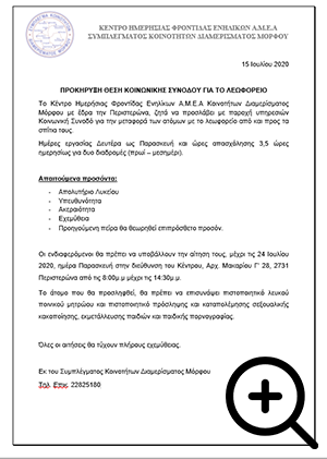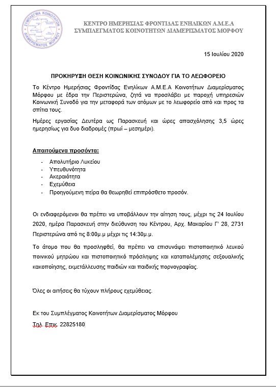 Προκήρυξη θέση κοινωνικής συνοδού για το λεωφορείο (μεχρι 24/7/2020)